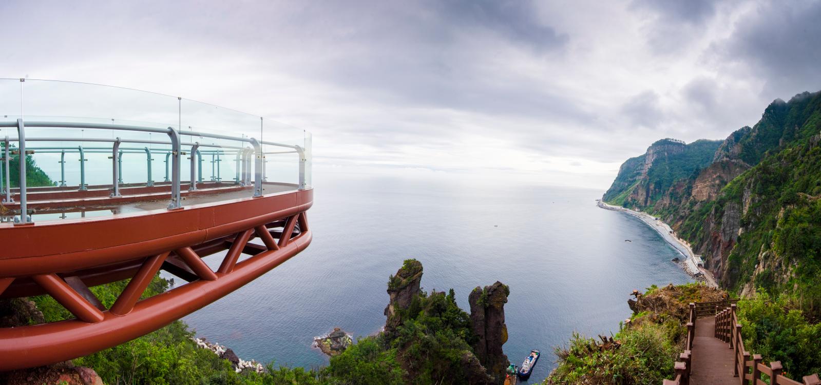 울릉군 북면 천부리에 위치한 '천부해중전망대'는 울릉도에서도 가장 독특한 전망대입니다. 바다 위에 세워진 구조물로, 투명한 바닥을 통해 바다를 바로 내려다볼 수 있는 이색적인 장소입니다. 마치 바다 위를 걷는 듯한 기분을 느낄 수 있어, 남녀노소 누구에게나 인기 만점입니다. 특히 파도가 잔잔한 날이면 바닷속 풍경이 선명하게 보여 더욱 특별한 체험이 가능합니다.